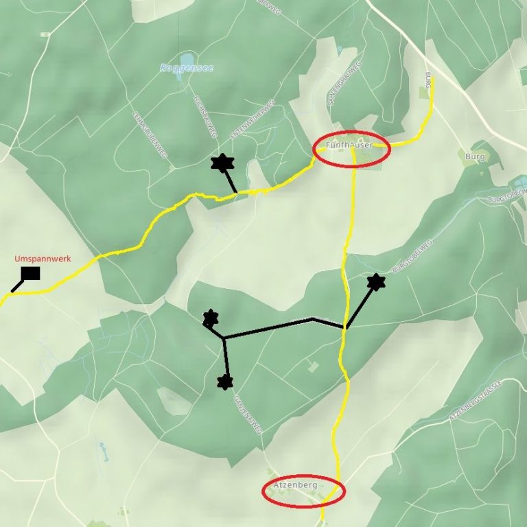 Die geplanten Standorte der Windräder mit Zufahrtswegen und Umspannwerk auf der Atzenberger Höhe